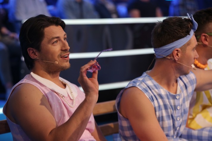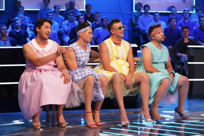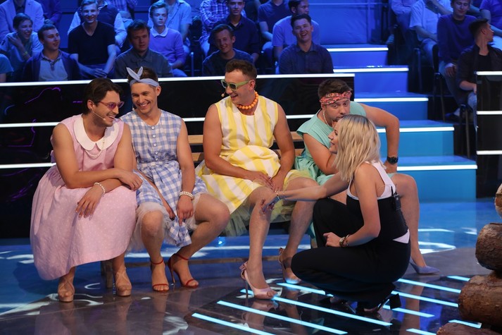 Разноцветные платья с пышными юбками, стильные очки, кокетливо повязанные косынки, чулки и каблуки. Ах, какие красотки появились на съемочной площадке шоу «Хто зверху?». Точнее, не красотки, а красавцы. Ведь в девиц-стиляг для участия в конкурсе «Обмен ролями» превратилась мужская команда шоу в полном составе – Иван Нави, Владимир Остапчук, Сергей Притула и Александр Бережок из «Дизель-шоу».