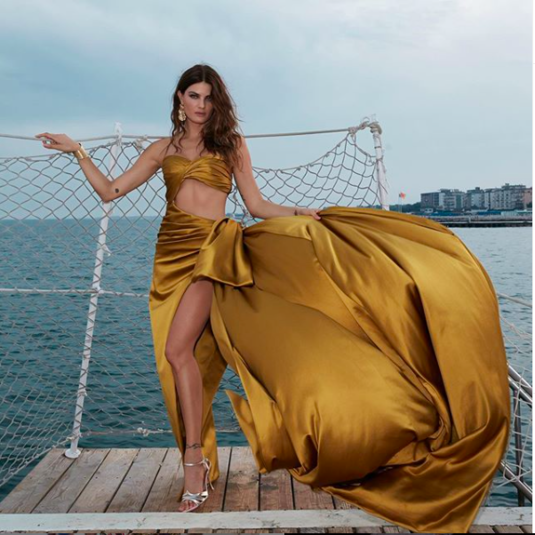 Изабель Фонтана отдала предпочтение эффектному платью от Alberta Ferretti, которое состоит из пышной юбки и топа желтого цвета. Образ «ангела» VS завершили золотые босоножки на высоком каблуке.