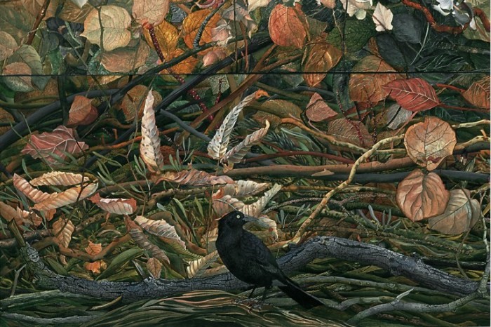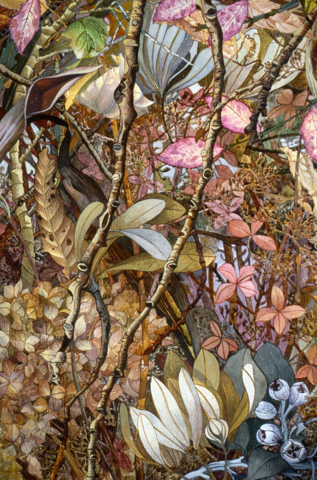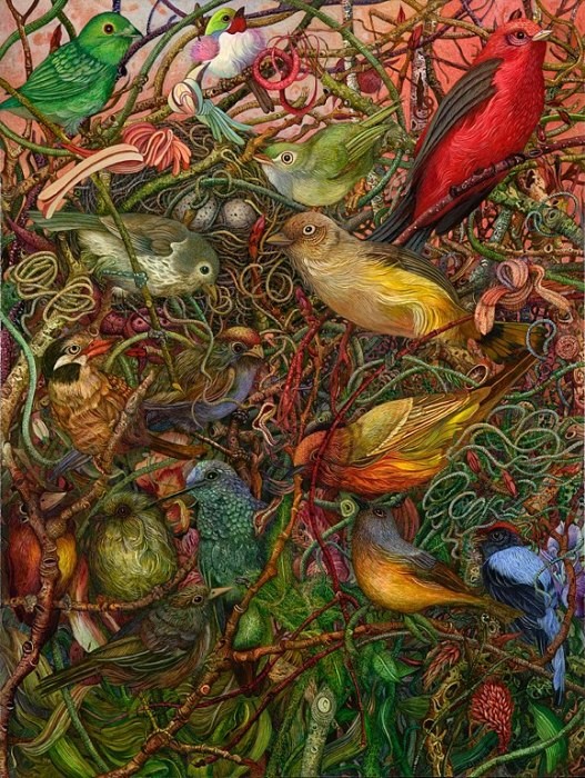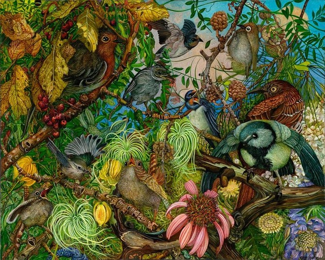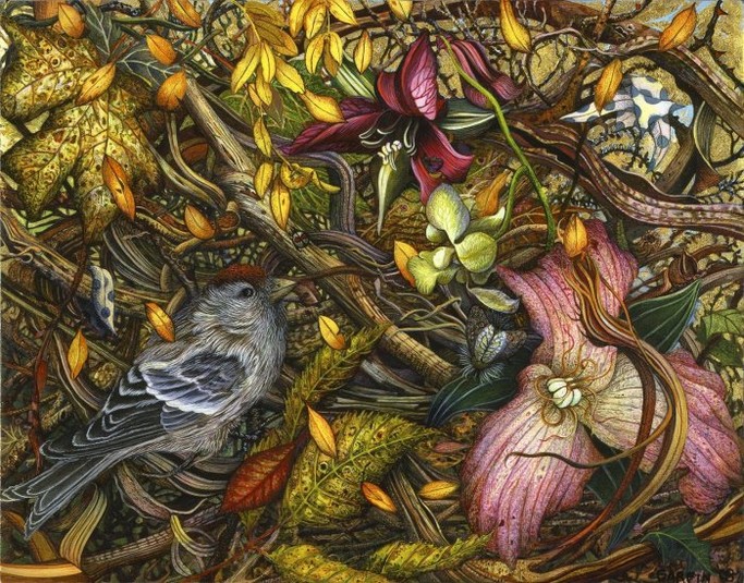 Витиеватые узоры растений, чьи стебли и листья сплетаясь между собой, тянутся к пёстрым птицам, сидящим на ветках.