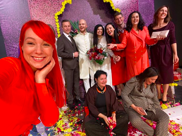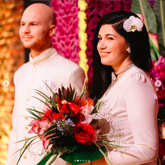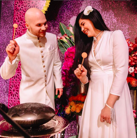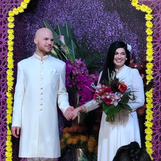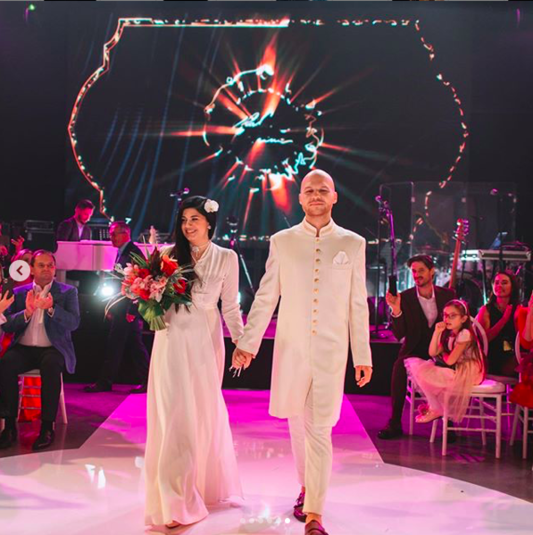 Церемония прошла в концертном зале Киева – Mayachok Event Hall. Влад Дарвин и Кристина Марти решили устроить свадьбу в индийском стиле. К алтарю артист вышел в светлой тунике и штанах.