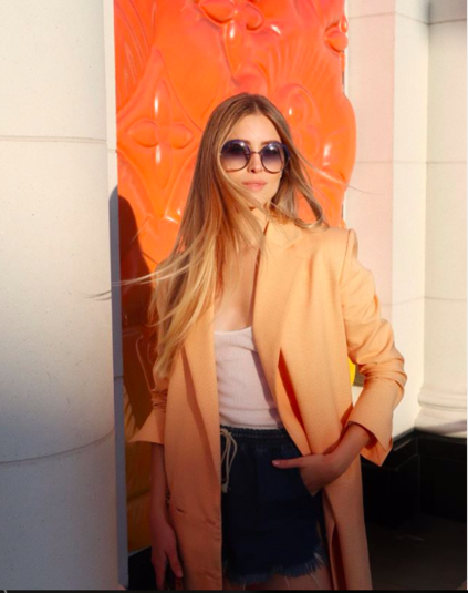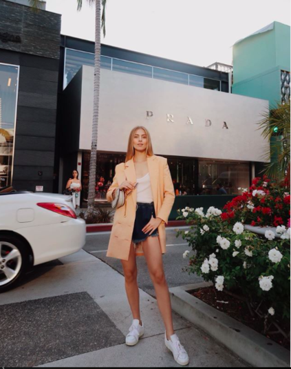 На новом фото девушка предстала в белой майке и джинсовых шортах. Она сделала образ более деловым за счет удлиненного жакета персикового цвета. Образ София дополнила белыми кедами. Благодаря наряду она подчеркнула свои стройные и длинные ноги.