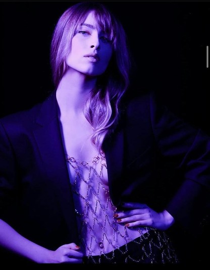 На новом фото красотка позирует в откровенном образе, на ней темные брюки и что-то напоминающее кольчугу из тонких цепочек, поверх которой она накинула черный пиджак. При этом на девушке нет бюстгальтера, что делает это фото еще более откровенным.