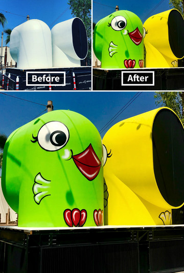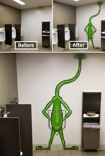 Иллюстратор из США Том Боб преображает самые прозаические элементы американских городов. Используя уличную «мебель», такую как парковочные столбики или электрические щитки, Том создает красочные и причудливые картины, которые взаимодействуют с их окружением.