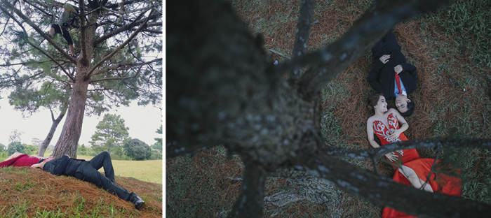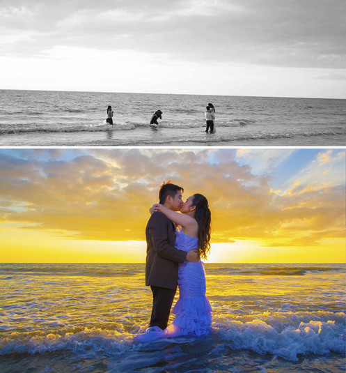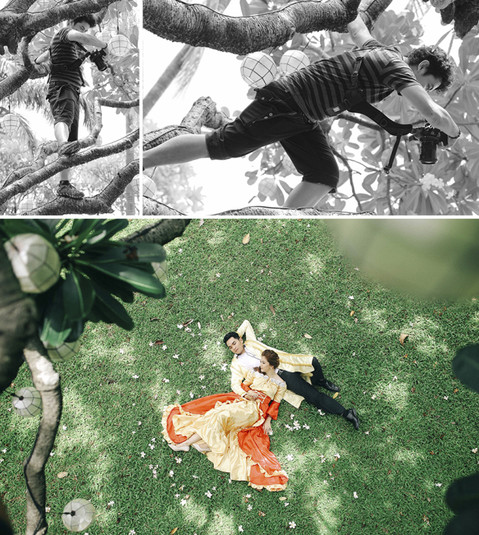 Чтобы сделать тот или иной кадр, он вместе с влюблёнными отправляется в самые необычные места. А чтобы достичь нужного результата, порой забирается не только на пальмы, но и на баскетбольные кольца, или же вовсе маневрирует с камня на камень, стараясь поймать в объектив своей камеры сцену в воде. Проделанная им работа поражает своей естественностью и красотой. Ведь благодаря таланту, терпению и живописным пейзажам, молодожёны просто светятся от счастья.