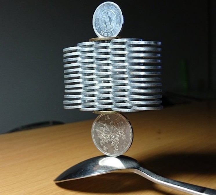 Мастер использует разные по весу монеты, а для пущего эффекта иногда добавляет в конструкцию и другие предметы. Опытные строители утверждают, что главное — это прочное основание, но Tanu своими творениями этот тезис опровергает. Для него и ложка на роль фундамента вполне подходит. Как часто японцу приходится собирать мелочь по всей комнате, история умалчивает.