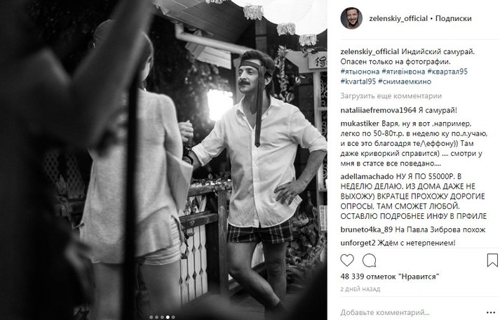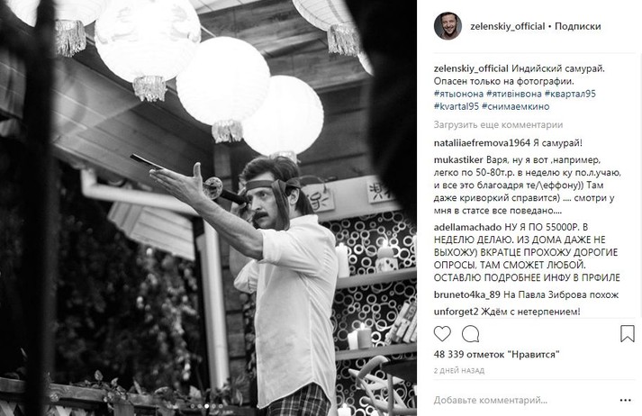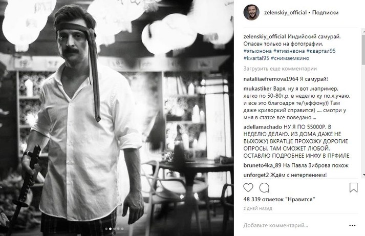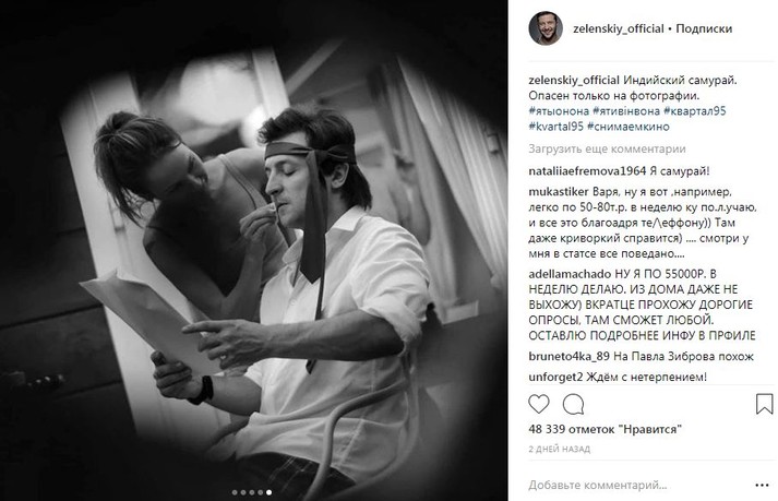 На своей странице в Instagram Зеленский опубликовал забавные снимки, на которых похож по мнению пользователей на украинского артиста Павла Зиброва. Правда сам Зеленский посчитал, что больше на индийского самурая.