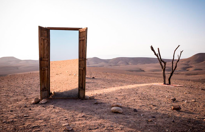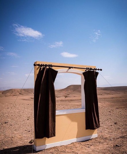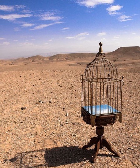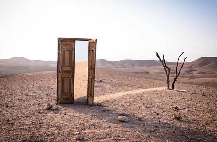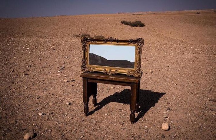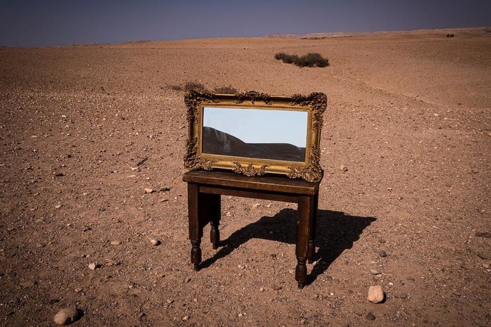 Новый проект Ширин сосредоточился в Марокко. Здесь, в сухих и знойных пейзажах, художница устанавливает свои гибриды: дверь с зеркалом в проеме, зеркальное окно, картинную раму — тоже с зеркалом.