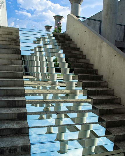 В первых инсталляциях они смотрели в небо и походили на порталы в потусторонние миры, к которым так или иначе причастен человек. Каменные колонны отражались в зеркальной реке, скрывавшей лестницу в итальянском городе, складывались в пирамиду и «вавилонскую башню», образовывали «небесные колодцы» на горячем золотом песке.