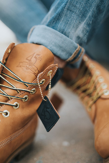 К юбилею креативные директора бренда Timbarland создали лимитированную коллекцию с надписью 45th Аnniversary на «языке» ботинка.