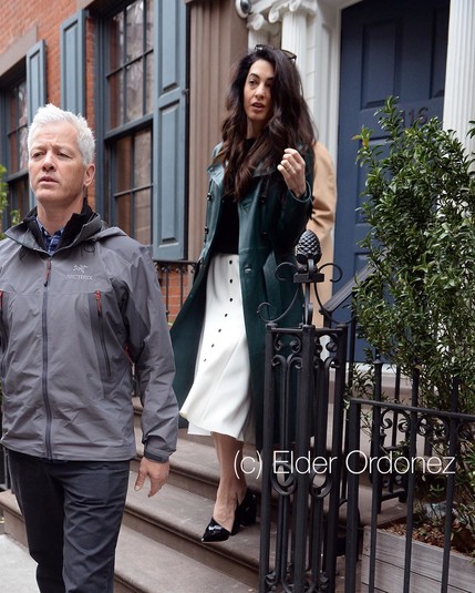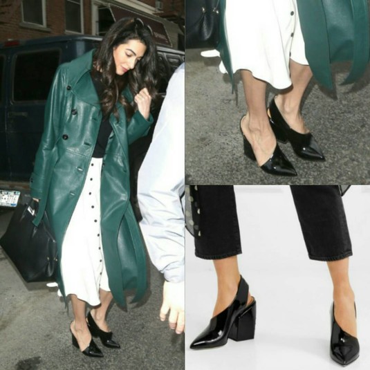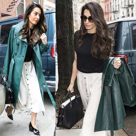Необычные черные туфли на каблуках и зеленый кожаный плащ из коллекции Michael Kors добавили стиля изысканному наряду Амаль Клуни. Сумка от Dior и легкий макияж завершили идеальный образ юриста.