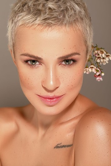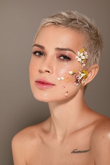 Она стала перед объективом топлесс, в парике, с горящей спичкой во рту, а также с нарисованными веснушками и цветами.