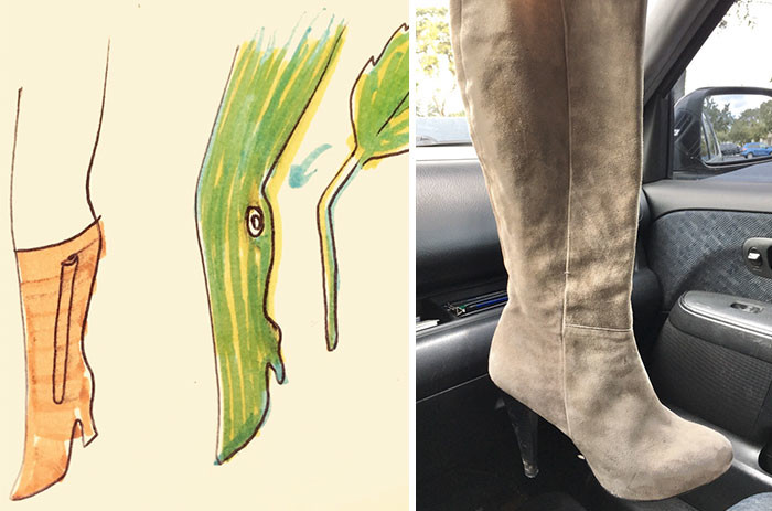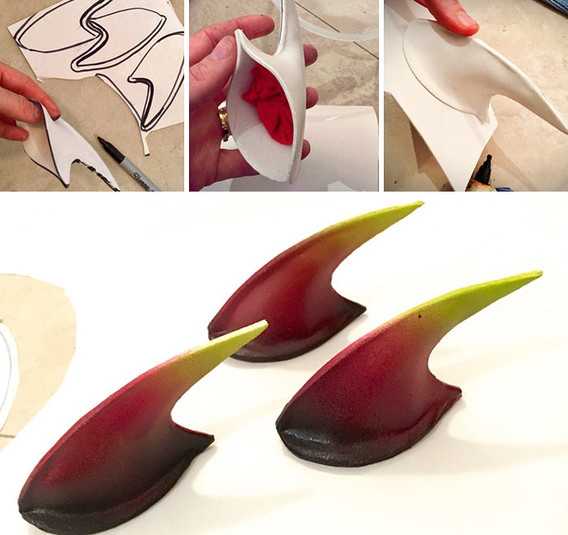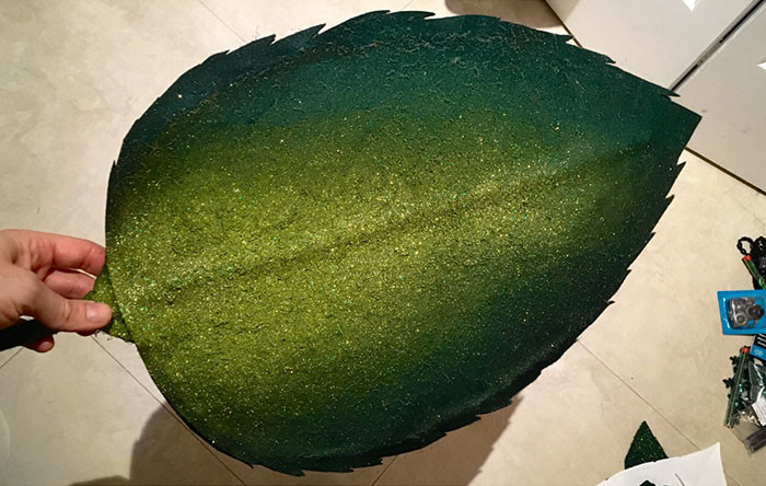 «Для листьев я покрыла длинные провода маскирующей лентой, а затем обернула их войлоком. Чтобы поддержать листья, я хотела вставить стебли через втулку в зеленые колготки. Мне нужны были высокие ботинки с плотной посадкой, плюс правильный каблук и форма носка. Вернемся к цветочной части. Пена очень хорошо подошла. Я использовала инструмент для выжигания по дереву, чтобы придать лепесткам реалистичную текстуру», - говорит девушка.