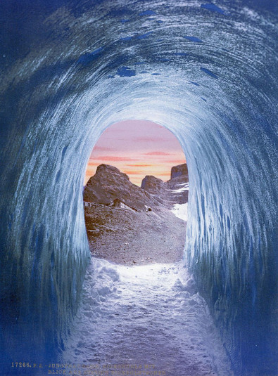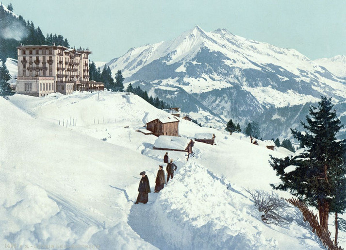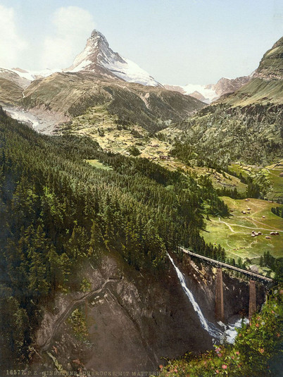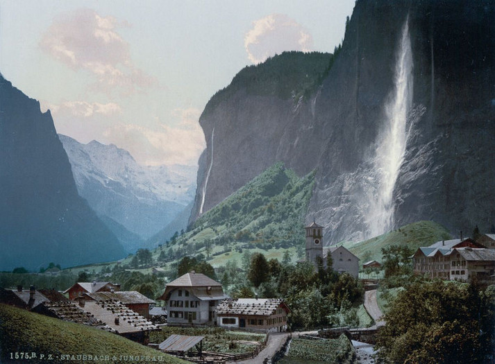Величественные горы, курортные города, ледники и водопады в старинных цветных открытках.