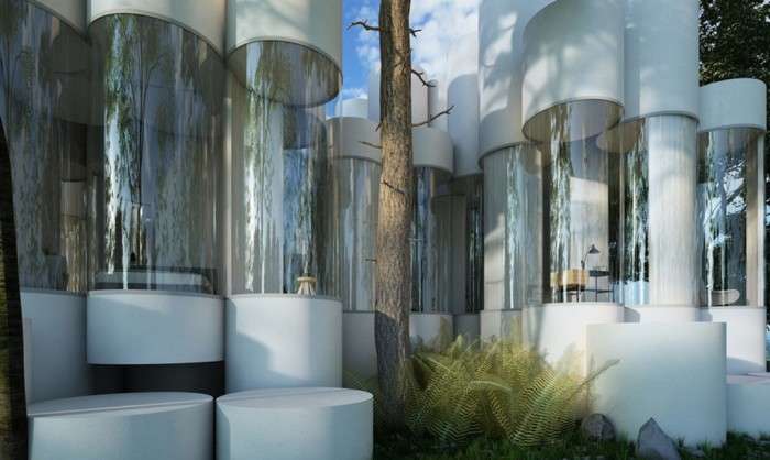 Стеклянные цилиндры разной высоты и конфигурации перемежаются между собой, образуя жилое пространство. К тому же подобная конструкция позволяет расширять площадь, если это необходимо. Сирил Ланселен утверждает, что его стеклянные цилиндры позволили размыть границу между внутренним пространством и окружающей средой.