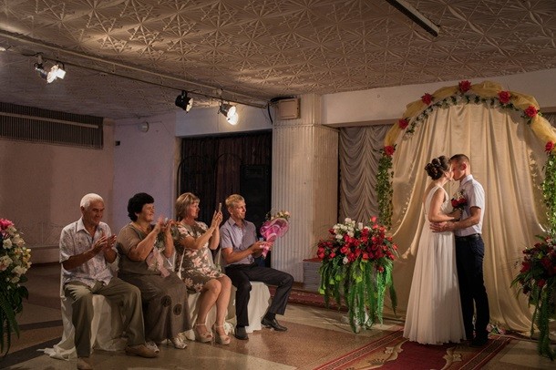 И еще одна трогательная украинская фотография - этим летом Алина и Игорь Лещина целуются во время свадебной церемонии в общественном центре, расположенном рядом с минным полем, в Авдеевке.