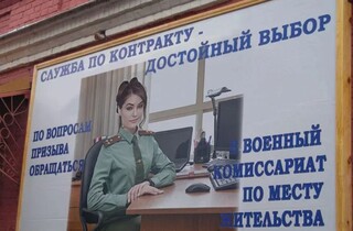 На банері зображена нібито росіянка у військовій формі, до фігури якої прикріпили обличчя Саші Грей. «Служба за контрактом – гідний вибір», – закликає з реклами колишня порноакторка. Саша Грей розмістила це зображення у своєму Twitter. Акторка припускає, що ця інформація може бути неправдивою. Однак разом з тим, Грей заявила, що не підтримує війну.