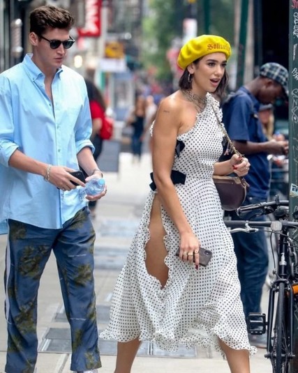 22-летняя артистка выбрала белое платье в черный горох с очень провокационным вырезом. Такой принт является хитом нынешнего сезона. Этот образ она дополнила ярко-желтым беретом и золотистыми босоножками на высоких каблуках. Звезду сфотографировали возле выхода из отеля Bond Hotel с ее любимым Айзеком Керю.