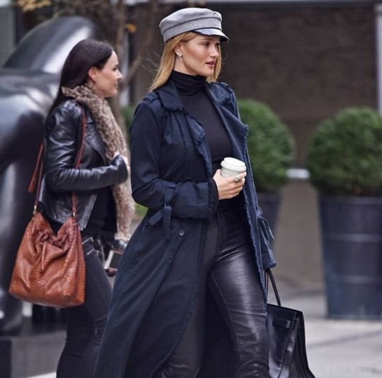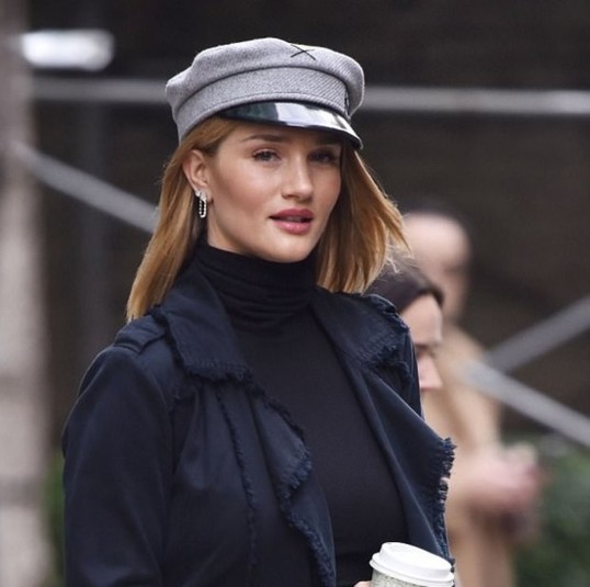 Знаменитая британская модель Роузи Хантингтон-Уайтли, которая сыграла в предыдущих частях «Трансформеров», примеряла кепку от украинского бренда Ruslan Baginskiy. Этим головным убором она дополнила свой городской стиль: темно-синее пальто, обтягивающие кожаные штаны и замшевые ботильоны на высоком каблуке.