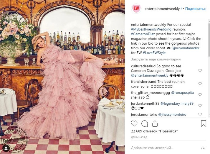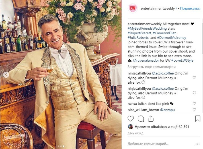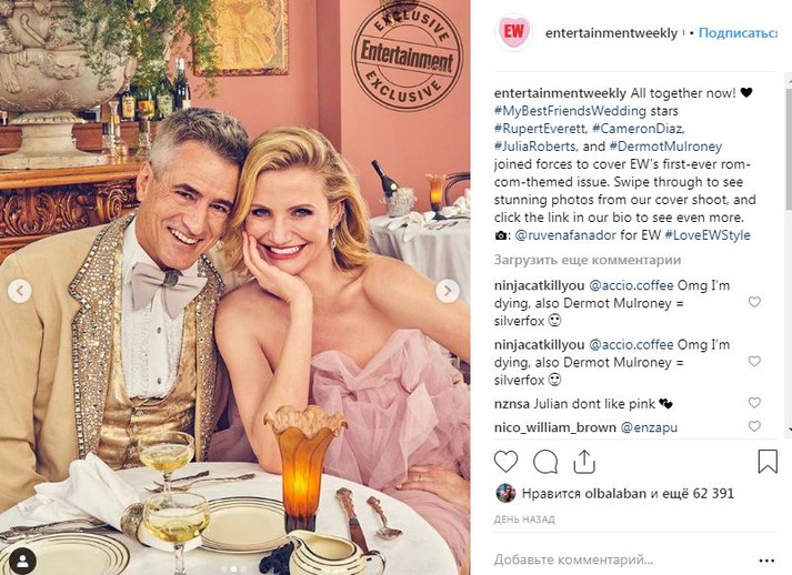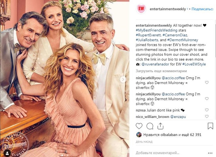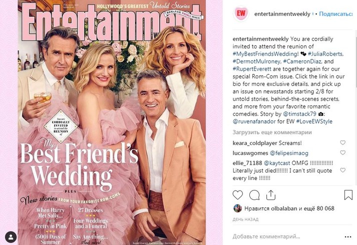 Звезды ромкома позируют в шикарных нарядах – на Джулии Робертс белоснежный приталенный костюм, Камерон Диаз облачена в пышное тюлевое платье. От Малруни и Эверетта, хоть и изрядно постаревших, тоже трудно отвести взгляд. Судя по счастливым лицам актеров, они сами были очень рады неожиданному воссоединению и с удовольствием предались воспоминаниям о съемках.