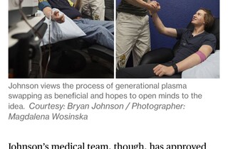 Крім того, кров Браяна і Талмаджа переливають і 70-річному батьку підприємця Річарду. Протягом кількох годин чоловіки обмінюються плазмою крові трьох поколінь у клініці охорони здоров’я поблизу Далласа.