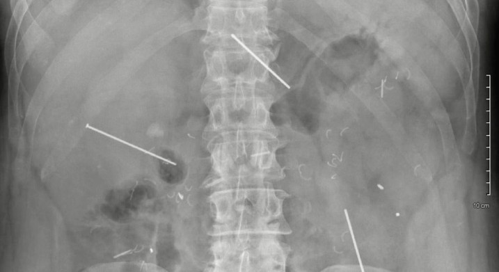 Оскільки біль зберігався, пацієнт повторно звернувся до медиків. Тоді йому призначили рентген черевної порожнини, який виявив у животі три сторонні тіла. Наступне КТ-обстеження показало, що три неушкоджені цвяхи були в районі печінки, підшлункової залози, дванадцятипалої кишки та тонкого кишечника.