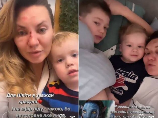 Акторка також розповіла, як відреагували діти на її травми: «Коли мене побачив старший Гліб, він розплакався. Обійняв мене і сильно плакав, йому було страшно на мене дивитись. А молодший Микита взагалі не відреагував, я йому однакова, що з таким страшним носом, що ні».