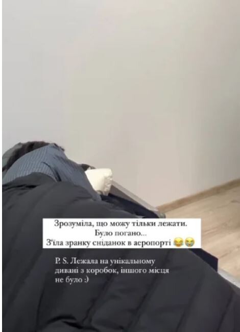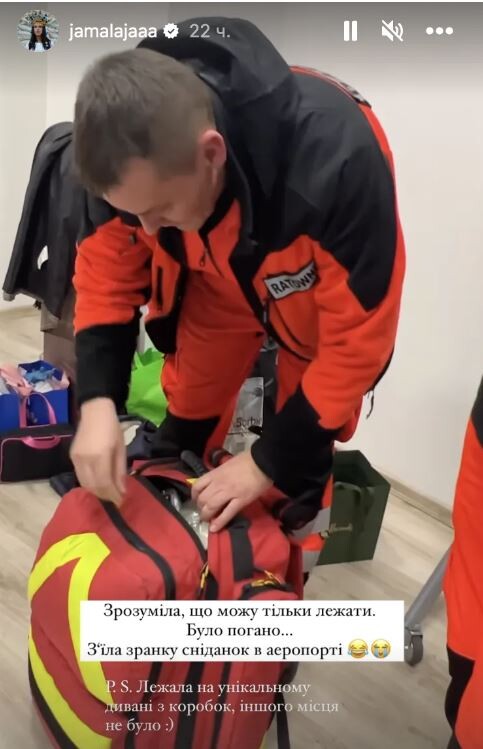 «За 15 хвилин до виходу було ось так. Думала, як зібратися. Зрозуміла, що можу тільки лежати. Було погано. З'їла вранці сніданок в аеропорту», – поділилася Джамала в Інстаграм знімками інциденту.