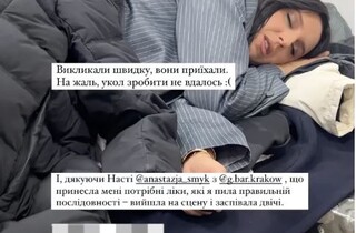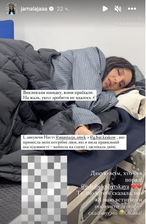 Артистці викликали «швидку», але лікарі з причин, про які артистка не пише, не змогли зробити їй укол. Співачка подякувала своїй команді, яка оперативно знайшла потрібні ліки та дала їх в правильній послідовності: «Лежала на унікальному дивані з коробок, іншого місця не було. Викликали швидку, вони поїхали. На жаль, укол зробити не вдалось».