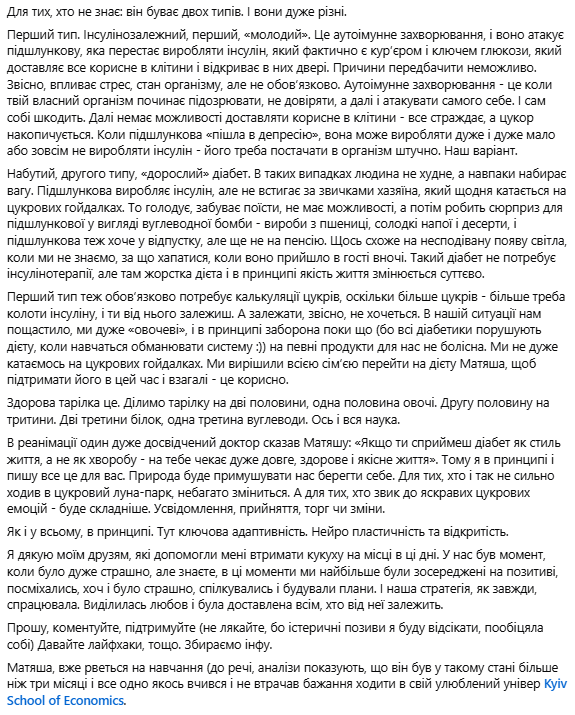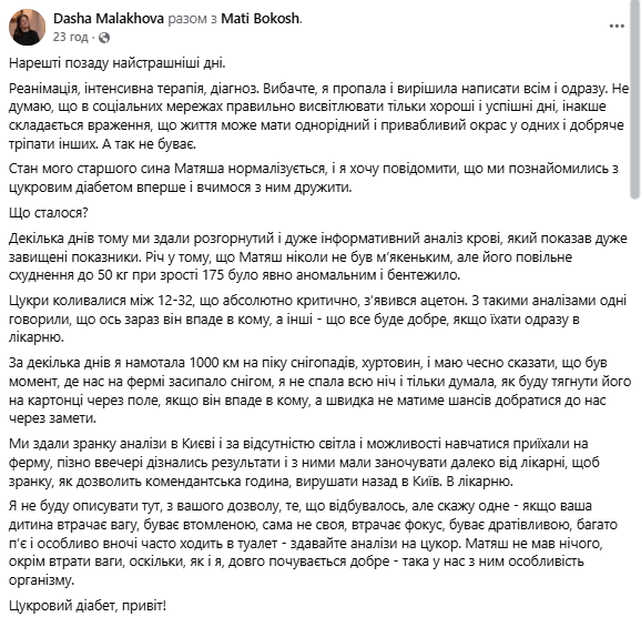 За словами Малахової, стан її сина нині стабілізується, і родина почала адаптуватися до нового способу життя. «Стан мого старшого сина Матяша нормалізується, і я хочу повідомити, що ми познайомились з цукровим діабетом вперше і вчимося з ним дружити», – написала акторка.