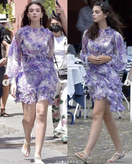 Кассель предстала в роскошном летнем образе. Она облачилась в воздушное мини-платье с цветочным принтом в лавандовых тонах. Look дополнили белые сандалии с позолоченной пряжкой узнаваемого логотипа.