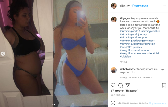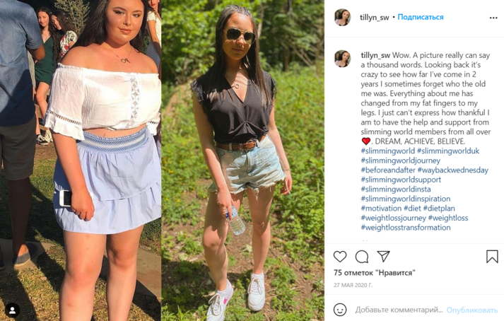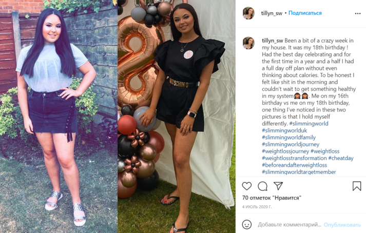 «Я часто получаю милые сообщения от людей, кого я замотивировала на преображение, и их прогресс делает меня счастливее. Я постоянно напоминаю им, что похудение — это марафон, а не спринт. Важно понять, что это долгий процесс, ничего не произойдет за один день. У меня ушло два года, но я наслаждалась каждой минутой и теперь хочу, чтобы и другие прошли этот путь на позитиве», - говорит Тилли Ниман.