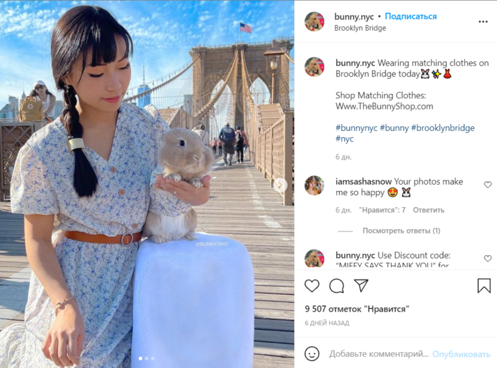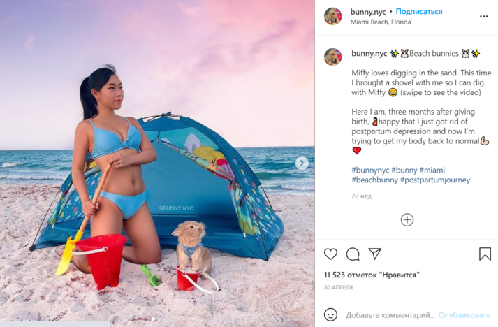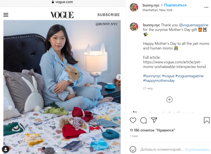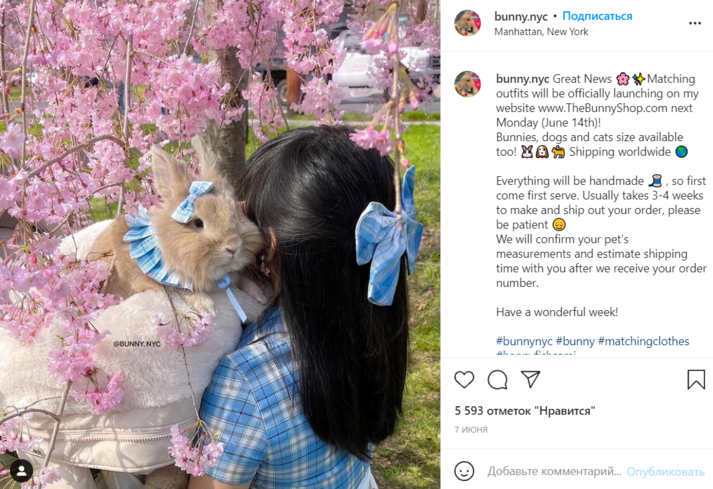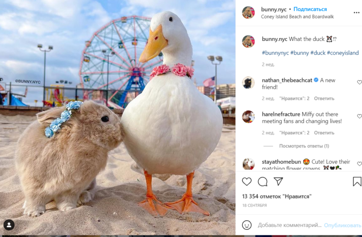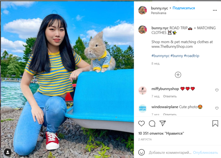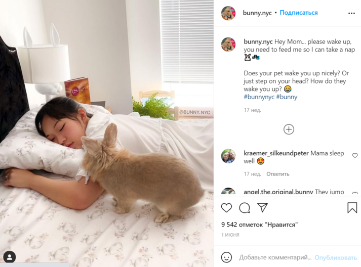 Чен никогда даже не предполагала, что Миффи станет не только ее любимцем, но и настоящей звездой соцсетей. Но когда парочка начала гулять по улицам Нью-Йорка, незнакомцы стали спрашивать Чен, есть ли у ее симпатичного кролика собственная страничка в Instagram. Тогда девушка решила создать аккаунт для Миффи, и он очень быстро стал популярным: сейчас на кролика подписаны более 105 тысяч человек.