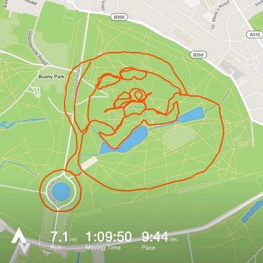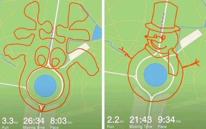 Житель пригорода Лондона Оуэн Делани нарисовал несколько рождественских символов (елку, Санта-Клауса и снеговика) с помощью фитнес-трекера Strava, позволяющего составлять маршрут пробежки по GPS-координатам.