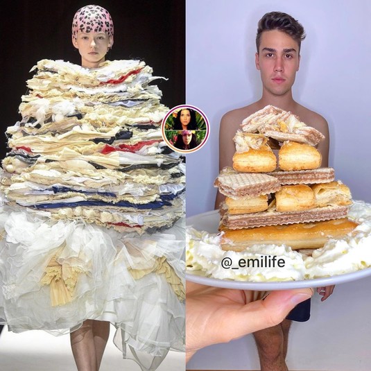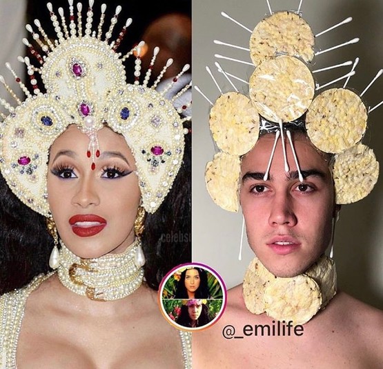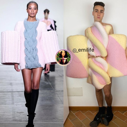 Парень воссоздает наряды звезд, используя подручные средства. В ход идут строительные материалы, предметы быта, канцелярия и даже продукты. После того как модель Кара Делевинь сделала репост его пародии на саму себя, на парня буквально обрушилась слава.