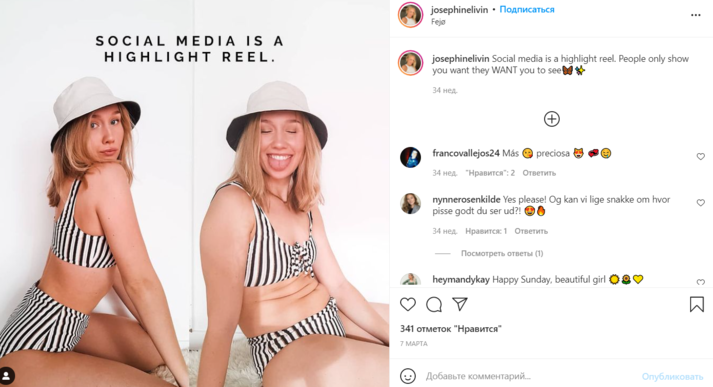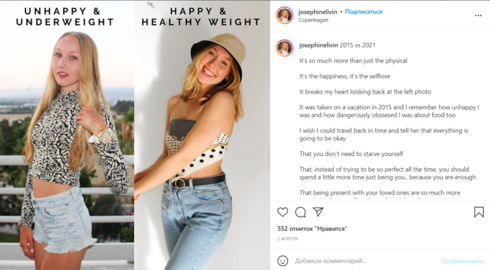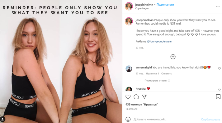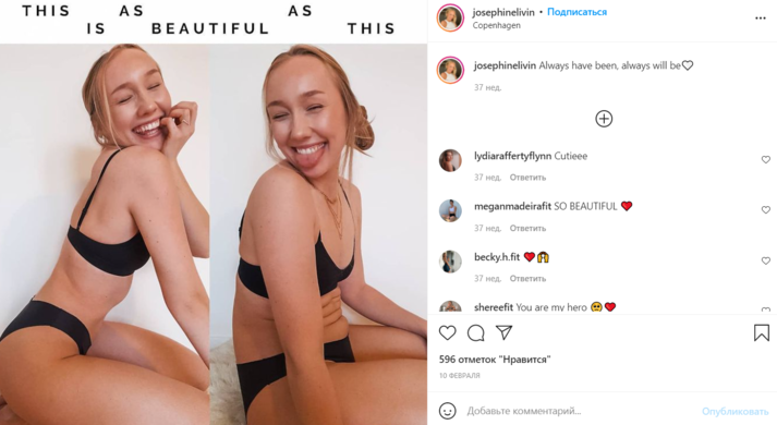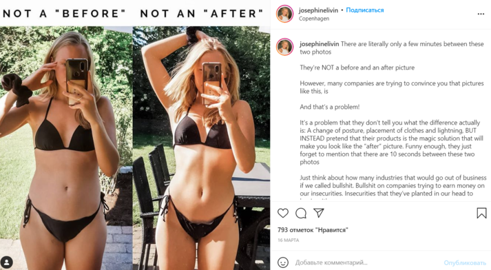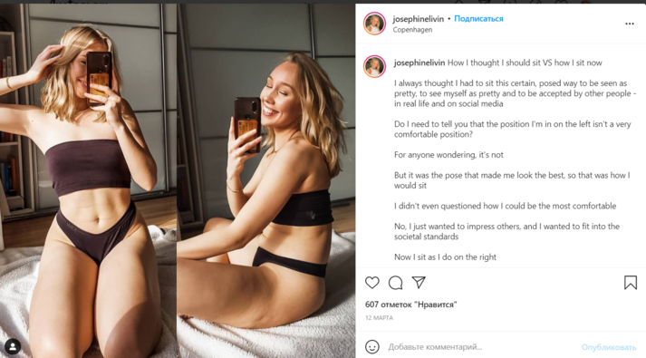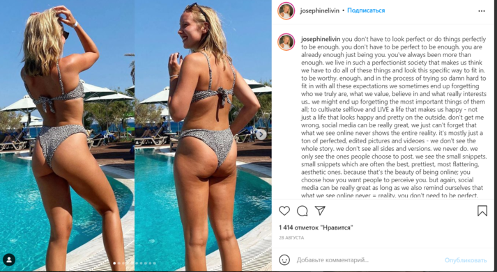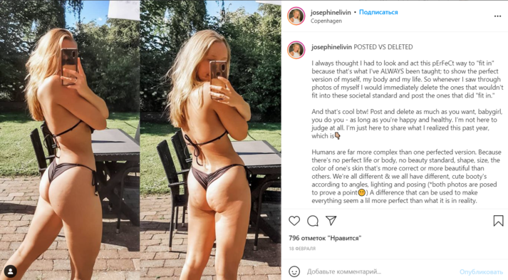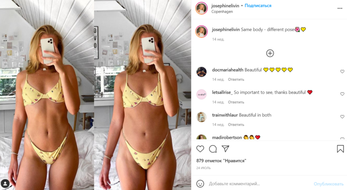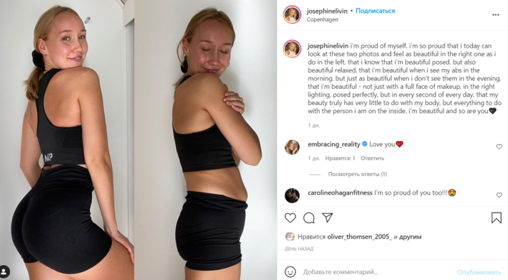 Джозефин Ливин (Josephine Livin) запечатлела себя в спортивном костюме, состоящем из голубого кроп-топа и розовых легинсов с высокой посадкой. На первом кадре она специально выставила ногу вперед и слегка повернула плечо к камере, чтобы выглядеть стройнее. На втором фото она опустила легинсы и показала, что на самом деле у нее полный живот.