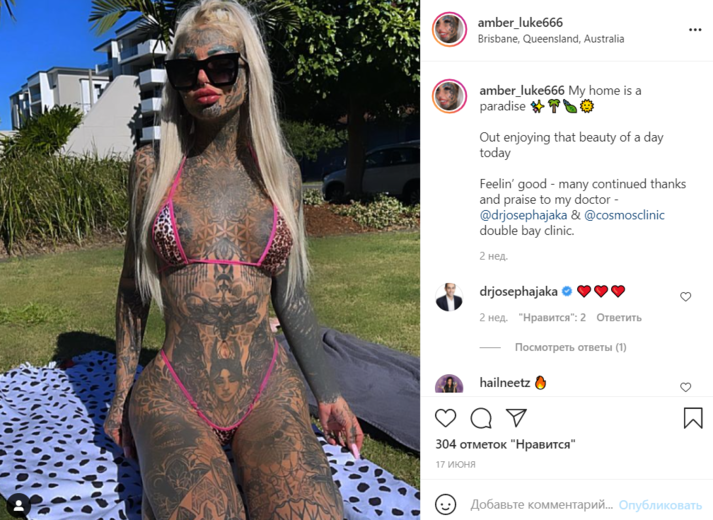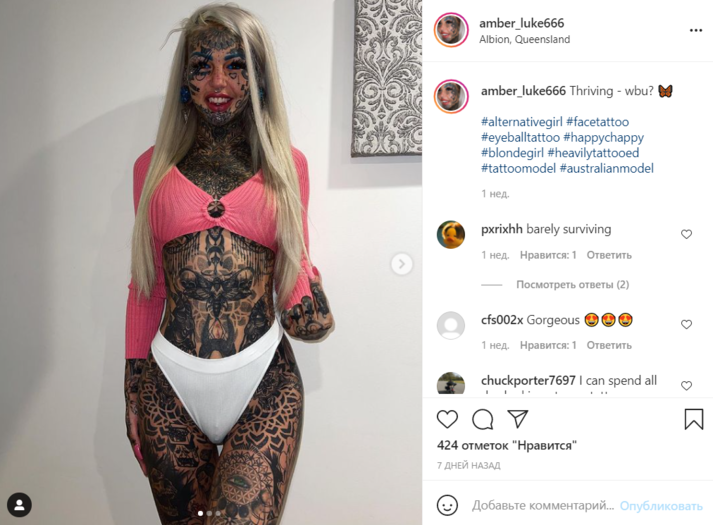 Так, австралийка покрыла татуировками 98 процентов своего тела, включая глазные яблоки. Помимо этого она растянула тоннели в ушах, сделала пирсинг губы, лба, носа и грудной клетки, увеличила грудь и ввела в лицо филлеры гиалуроновой кислоты и ботокса.