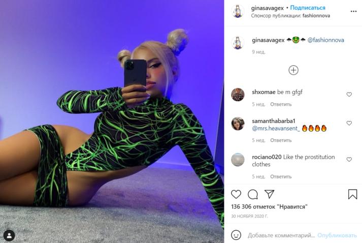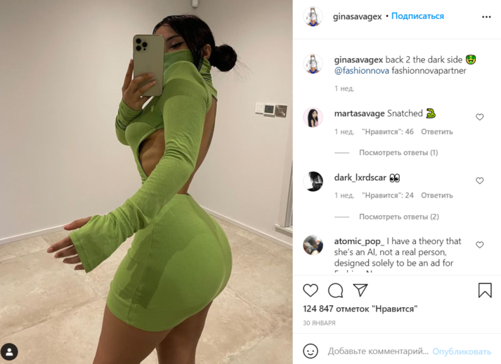Джина надела ярко-зеленое платье, которое у многих вызвало ассоциации с Гринчем — похитителем Рождества. Однако он немало проигрывал в сравнении с девушкой, у которой в глубоком разрезе виднелась подтянутая спина, а ниже полснимка занимали немаленькие ягодицы — на них модель тратит не один час в спортзале. Но Джину снова подвела талия, которая кого-то в комментариях рассмешила, а кого-то — изрядно испугала.