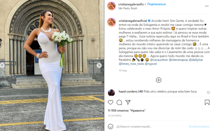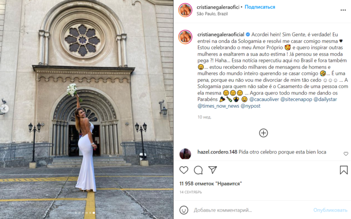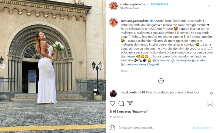 Галера вышла замуж за саму себя 14 сентября. Тогда она опубликовала в Instagram фото в свадебном платье и букетом на фоне церкви.
