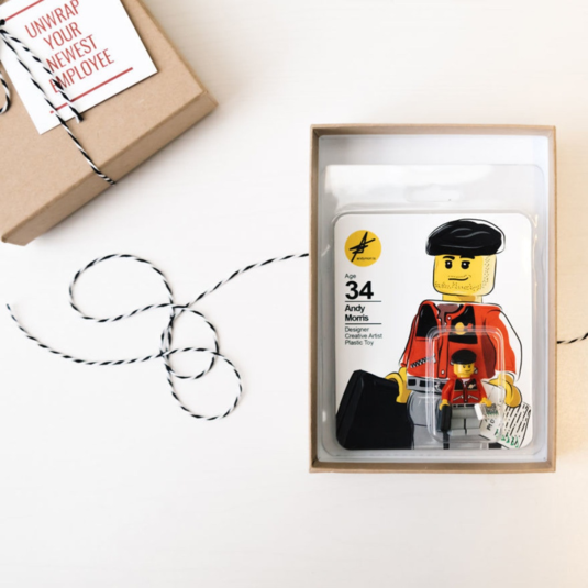 К фигурке дизайнер прикрепил карточку с предложением «распаковать вашего нового сотрудника».