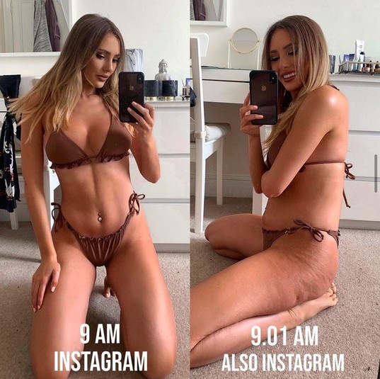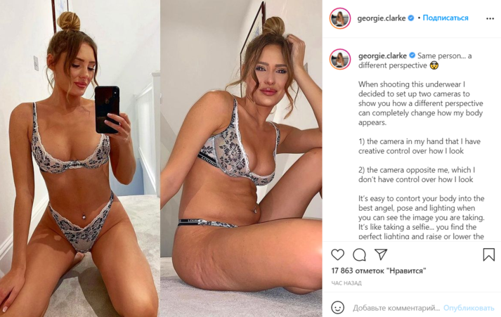 Модель Джорджи Кларк устала от идеальных фотографий в Инстаграме и показала, как выглядит женское тело на самом деле. Девушка позировала в полупрозрачном белье, представ перед камерой в двух ракурсах. И если на первом фото ее тело выглядит без недостатков, то со спины открывается совершенно другая картина. Все дело в правильной позе и освещении, но разве они влияют на красоту человека?