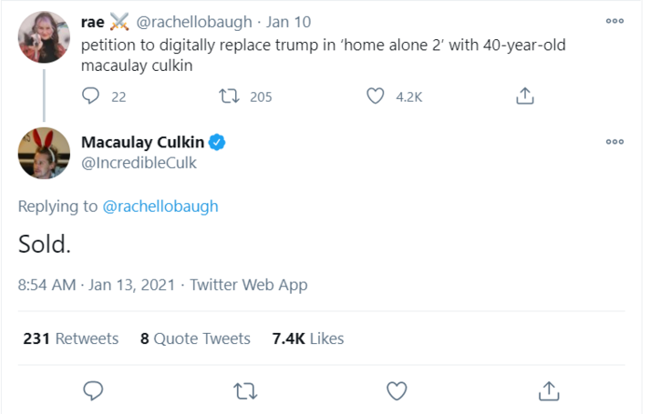 Сегодня Калкин обратил внимание на работу и написал в комментариях: «Браво!» Актер также ответил на просьбу пользователя под ником rachellobaugh, которая попросила заменить Трампа на 40-летнего Калкина. «Продано», — написал Калкин, видимо, посчитав это предложение лучшим.