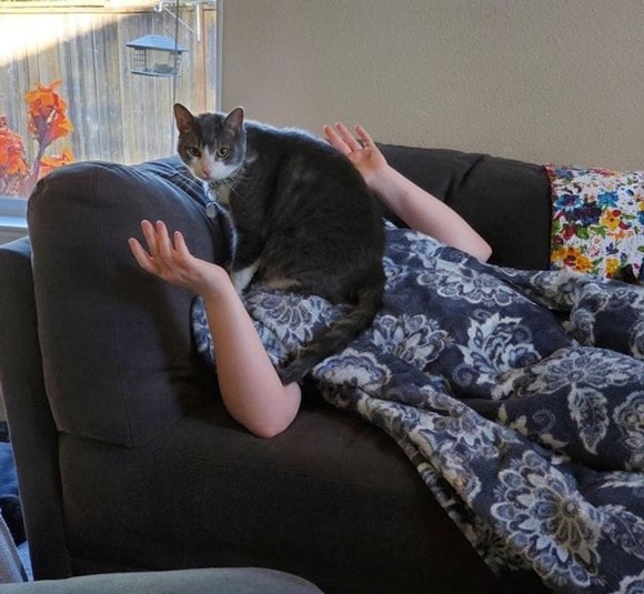 «Когда хочешь немного вздремнуть, но нет», «Уходи, человек, теперь моя очередь играть», «Наш кот не устает напоминать, кто здесь босс», «Я просто хотела с ними сфотографироваться…», «Да, это лучшее место, чтобы посидеть», «Разбудила кота, пока перекладывала ноги. Его лицо», - шутят в комментариях пользователи сети.