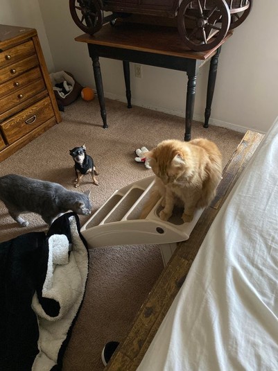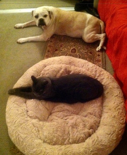 «Коту не нравится, когда пес пытается с ним играть», «Купили псу ортопедическую кровать, поскольку он стареет. Но он боится кота», «Кошка знает, что это собачья лежанка, но ее не волнует», «Мне нужно защищать собаку от кошек, пока она ест. В противном случае они прогоняют ее и все съедят сами», «Доминирующий кот и хороший песик», «Кошки вообще частенько выбирают для сна не свои лежанки, а собачьи, и несчастным друзьям человека остается только смотреть на хозяев грустными глазами. Взгляните сами!», «Собака хочет подняться по лестнице на кровать, но кот отказывается двигаться, - комментируют фото пользователи сети.