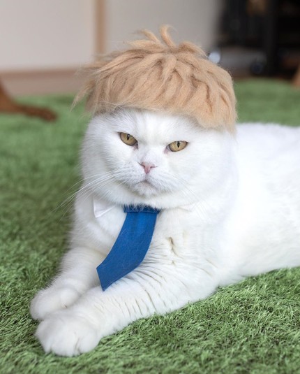 Среди того, что оказалось на головах у кошек, — крохотный шлем викинга, шапка волшебника и парик президента США Дональда Трампа.