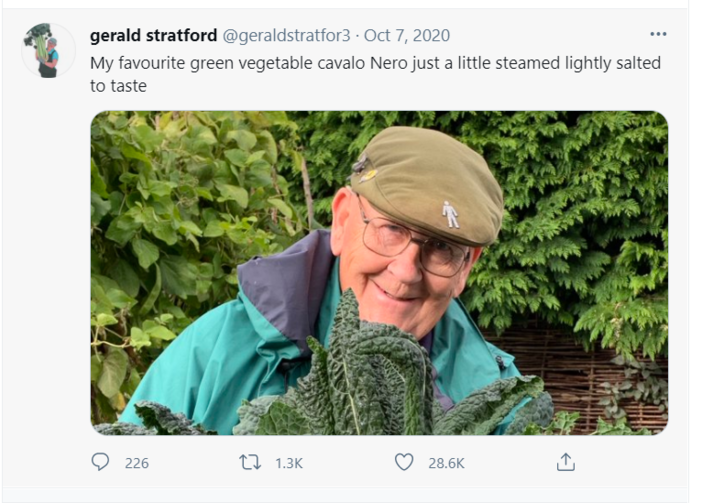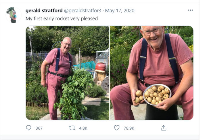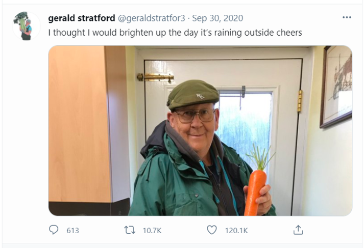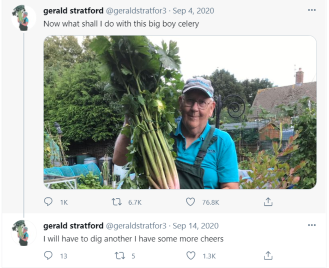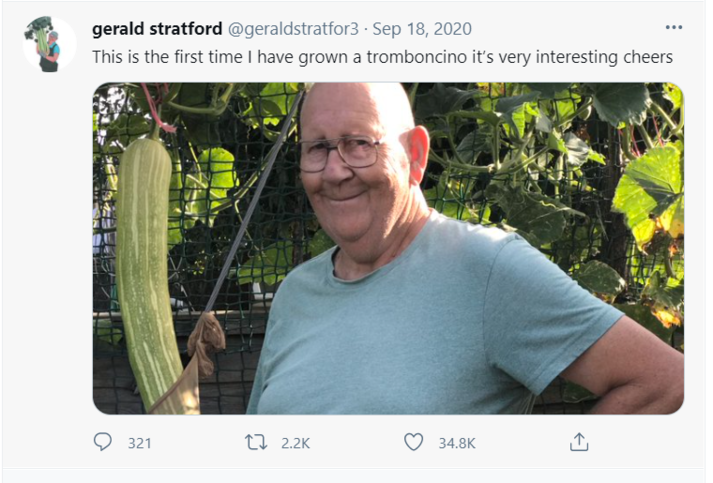 В октябре 2020 года фото огородника Джералда Стрэтфорда с его урожаем стали вирусными, с тех пор количество подписчиков на его странице выросло в два раза — до 280 тыс.