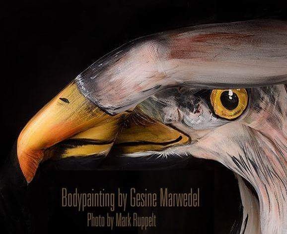 Немка всю жизнь рисовала, но несколько лет назад попробовала свои силы в рисунках на теле. В своих работах девушка чаще всего рисует птиц. Орлы, фламинго, голуби и другие выглядят невероятно реалистично. Неподготовленный зритель легко мог бы принять иллюстрацию за настоящих пернатых.