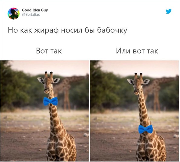 Тогда SortaBad подумал о том, как бы носил бабочку обладатель действительно длинной шеи — жираф. Парень запостил свой вопрос в сети, но никак не ожидал той реакции, которая на него обрушилась, сообщает HuffPost.