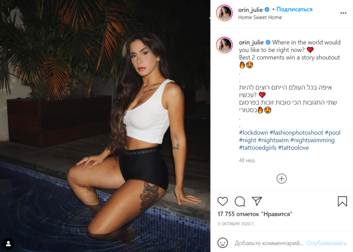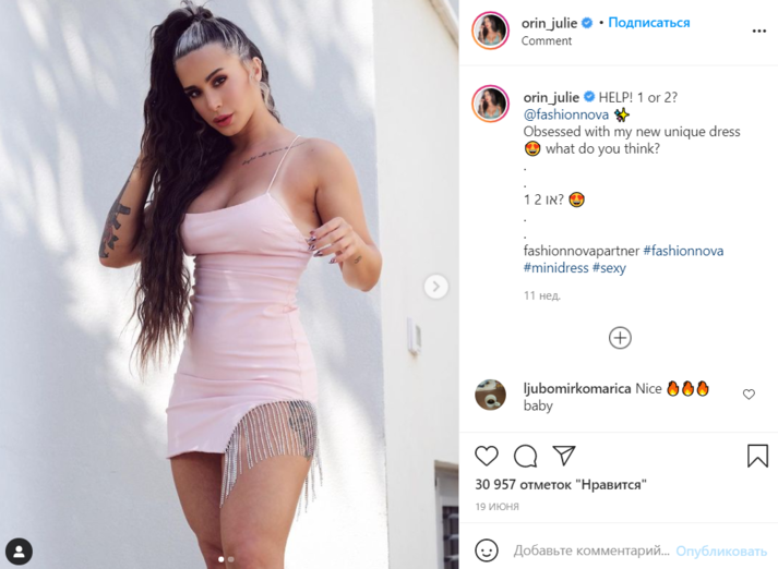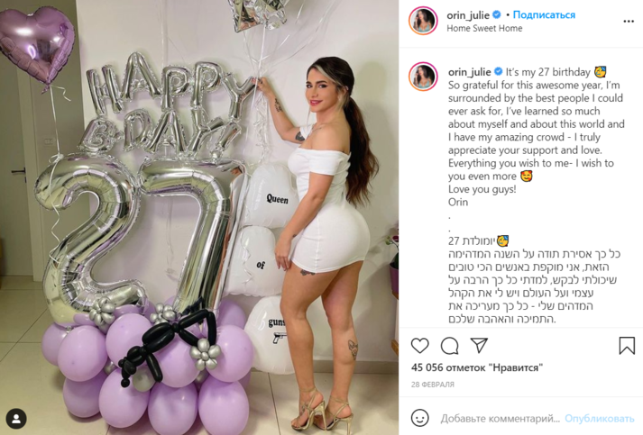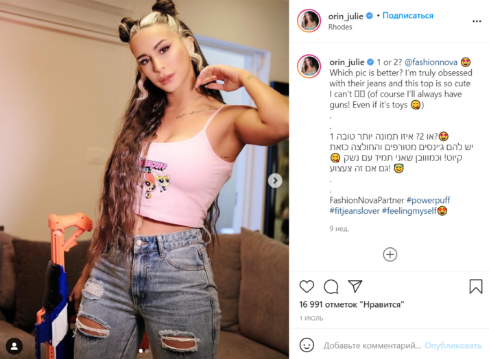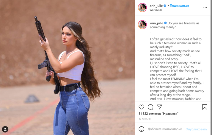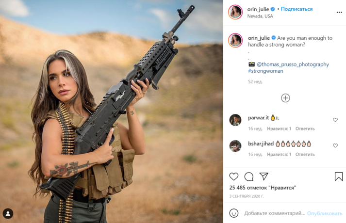 Своими успехами блогерша делится в Instagram, который насчитывает 620 000 подписчиков. Орин обожает откровенные фотосессии с оружием и военной формой.