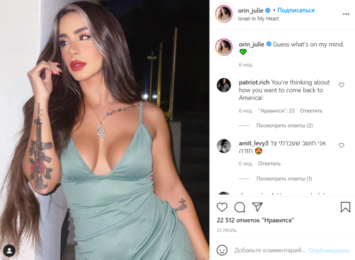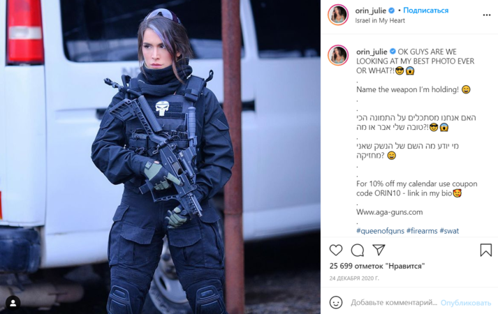 25-летняя Орин Джули прославилась в интернете благодаря эффектным фото. Известная как «Королева пушек», девушка служила в израильской армии, а с недавних пор занялась модельной карьерой.