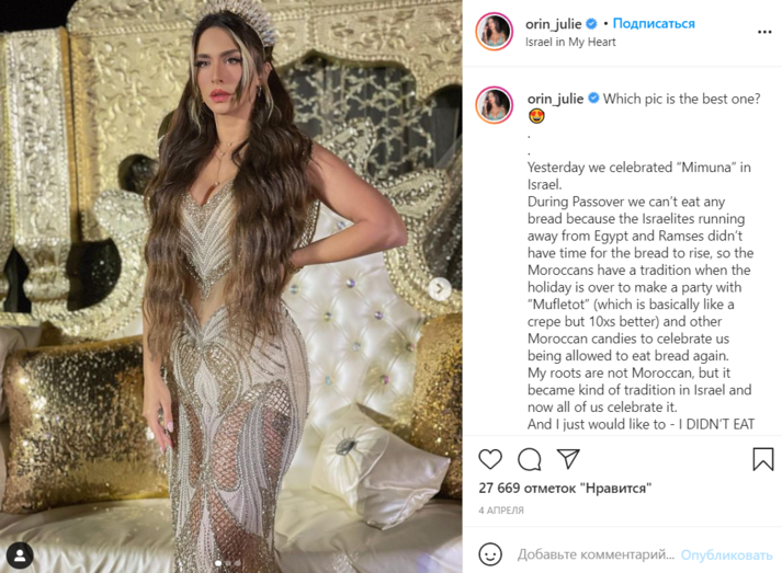 Орин Джули рассказывает, что занимается спортом 6 дней в неделю, чтобы держать тело в форме. Такая целеустремленность в сочетании с соблазнительными формами и принесла модели мировую известность. Ее фотосессии в откровенной спортивной или военной одежде собирают тысячи восторженных комментариев.
